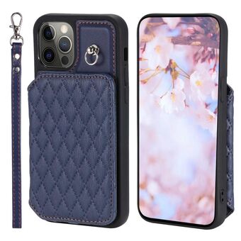 For iPhone 12 / 12 Pro Grid Texture Card Bag Phone Case with Lanyard(Blue)