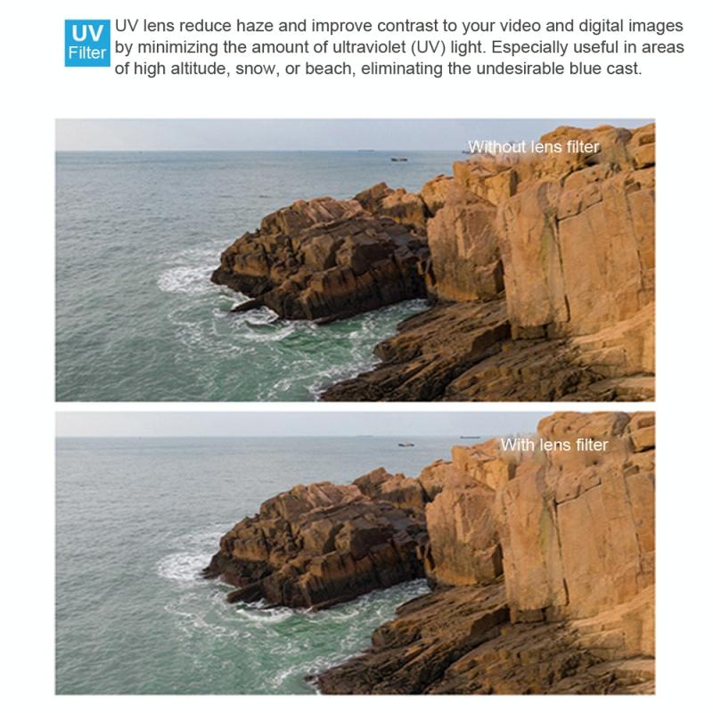 4. UV filters reduce haze and improve contrast to your video and digital images by minimizing the amount of ultraviolet (UV) light. Especially useful in areas of high altitude, snow, or beach, eliminating the undesirable blue cast. High level of transmittance.