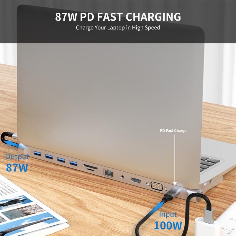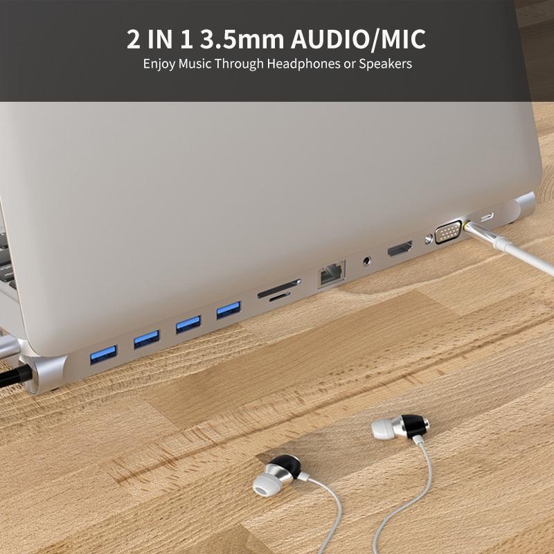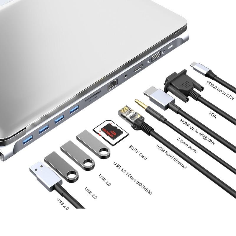 1. Extensive capability: 11-in-1 USB Type-C hub includes 1*Micro SD card reader, 1*TF card reader,1*USB 3.0 Ports, 3*USB 2.0 Ports,1*Type-C PD charging port, 1*4K HDMI video output,1*VGA video output,1*3.5mm Audio Port,1*RJ45 Ethernet Port.