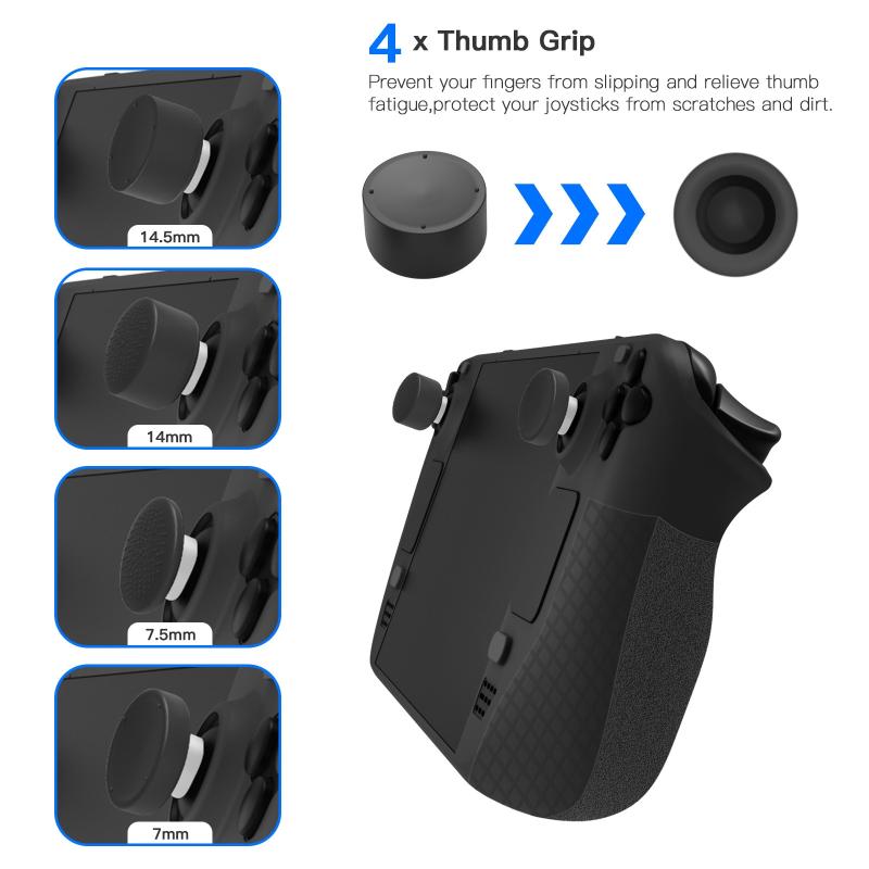 1. 4 thumb grips prevent finger slippage, relieve thumb fatigue, and protect the joystick from scratches and dirt