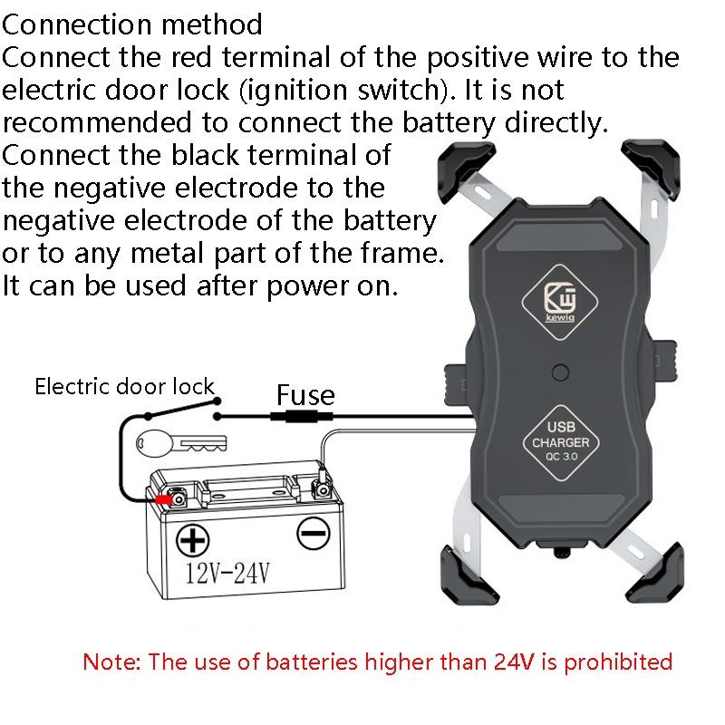 1. Connect the red terminal of the positive wire to the electric door lock (ignition switch). It is not recommended to connect the battery directly. Connect the black terminal of the negative electrode to the negative electrode of the battery or to any metal part of the frame.