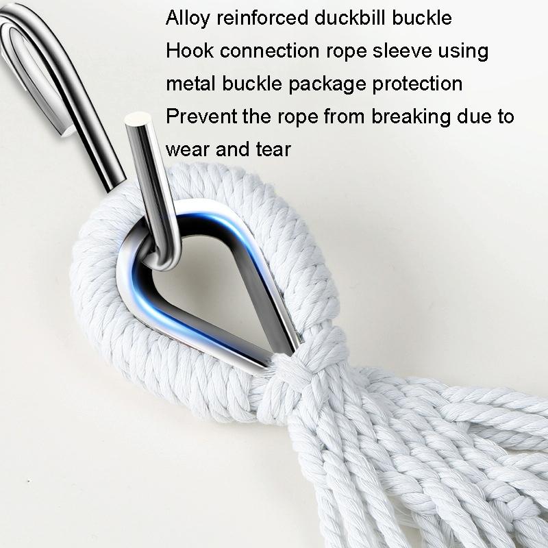 3. Alloy reinforced duckbill buckle, hook connection rope sleeve using metal buckle wrapped protection, to prevent the rope from breaking because of wear and tear