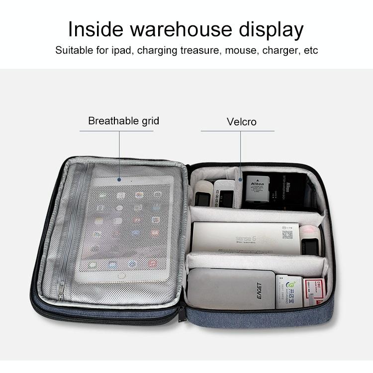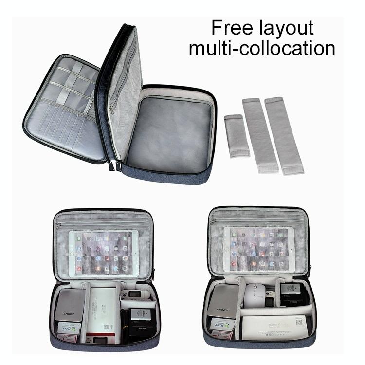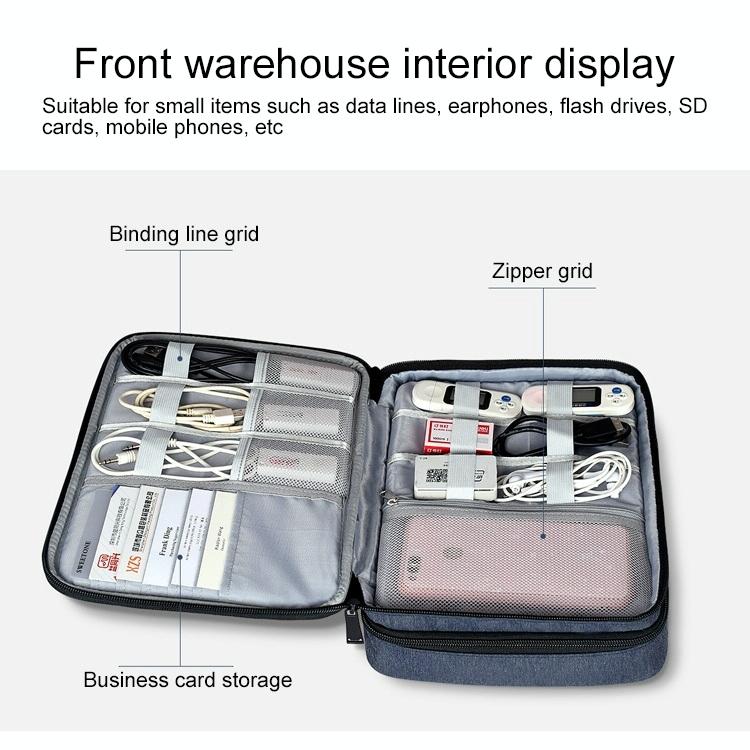 2. Front warehouse: tie line grid + zipper grid + card storage, rear warehouse: zipper grid + hook and loop fastener, can be placed in data lines, headphones, iPad, charging treasure and other large and small objects.