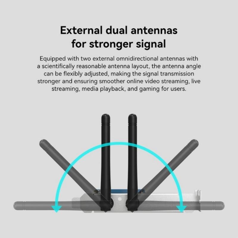 6.Equipped with two external omnidirectional antennas witha scientifically reasonable antenna layout, the antenna anglecan be flexibly adjusted, making the signal transmissionstronger and ensuring smoother online video streaming, livestreaming, media playback, and gaming for users.