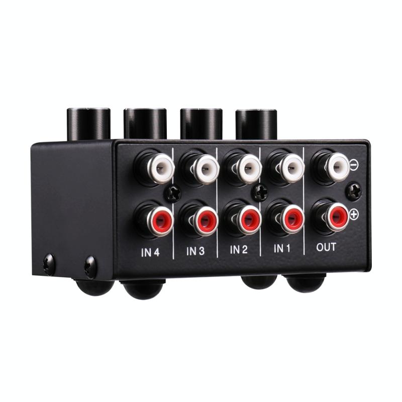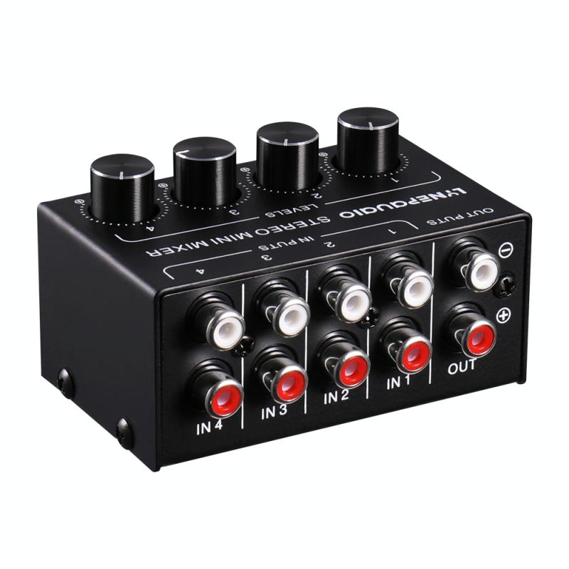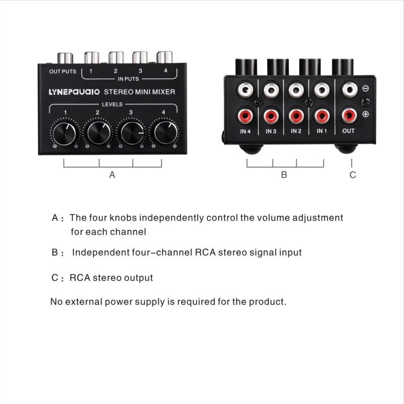 1. Mini passive stereo mixer is a stereo four-way passive mixer for extended control tuning, mixing instrument, CD player, tape player, computer, mobile phone, tablet and so on. No battery or other power source required. The device can also be used as 1 In 4 Out stereo distributor clockwise to adjust the volume.