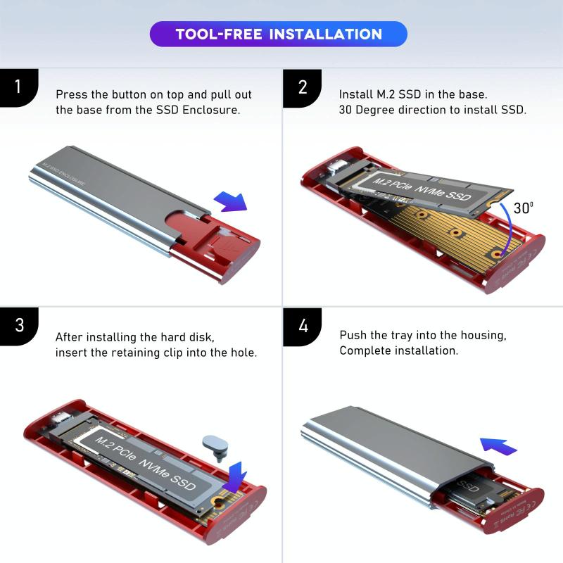 1. This M.2 NVMe/SATA Tool-Free External Enclosure transforms your M.2 SSD into a portable high-performance storage device. Supports dual-protocol transmission for broad compatibility and ultra-fast read/write speeds.