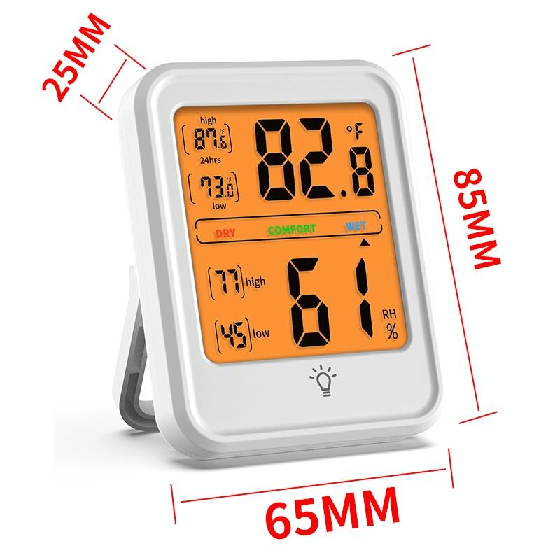 4. Function description: display the highest and lowest temperature humidity in 24, real-time temperature display, real-time humidity display, comfort prompt, touch backlight