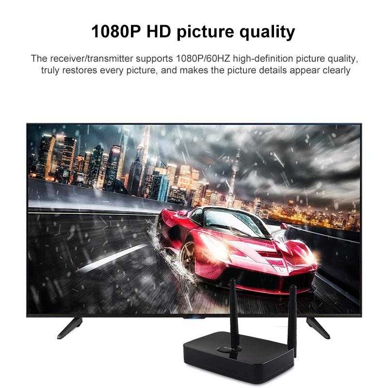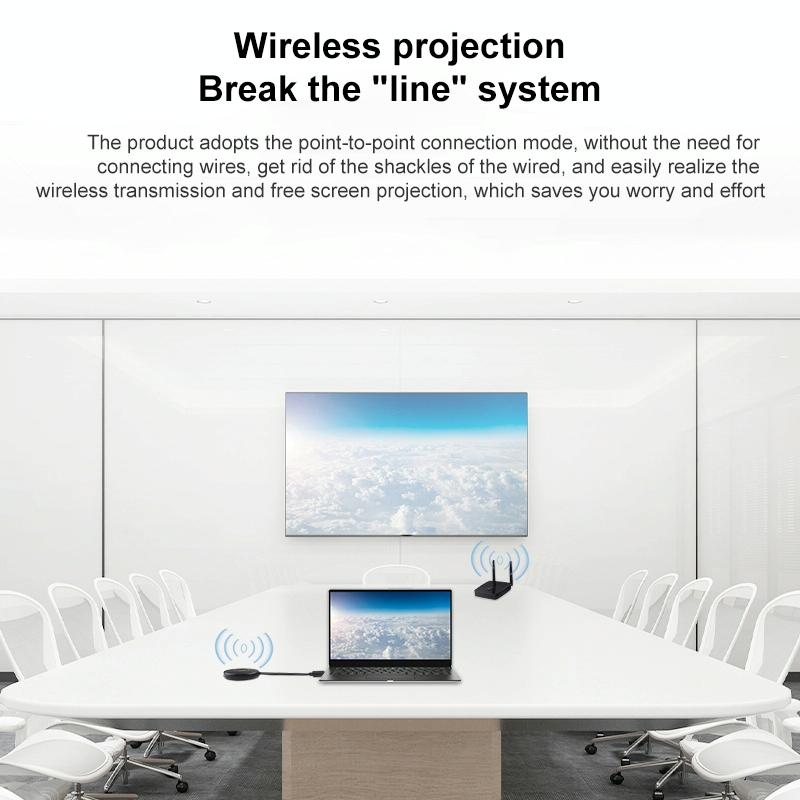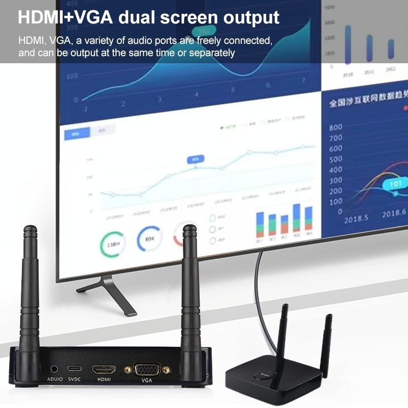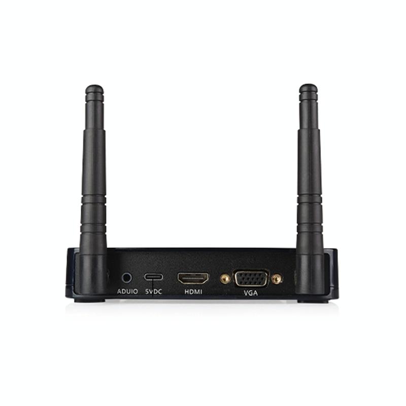 7. The receiver adopts HDMI+VGA dual port, using WiFi transmission technology, through the point-to-point connection between the transmitter and receiver equipment, the image/video console and set-top box of MAC, notebook, PC, mobile phone, game and set-top box can be connected with HDTV, Projector or monitor synchronization