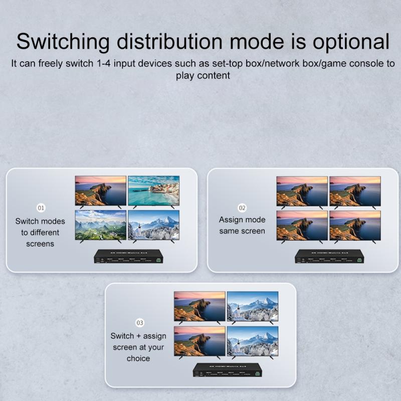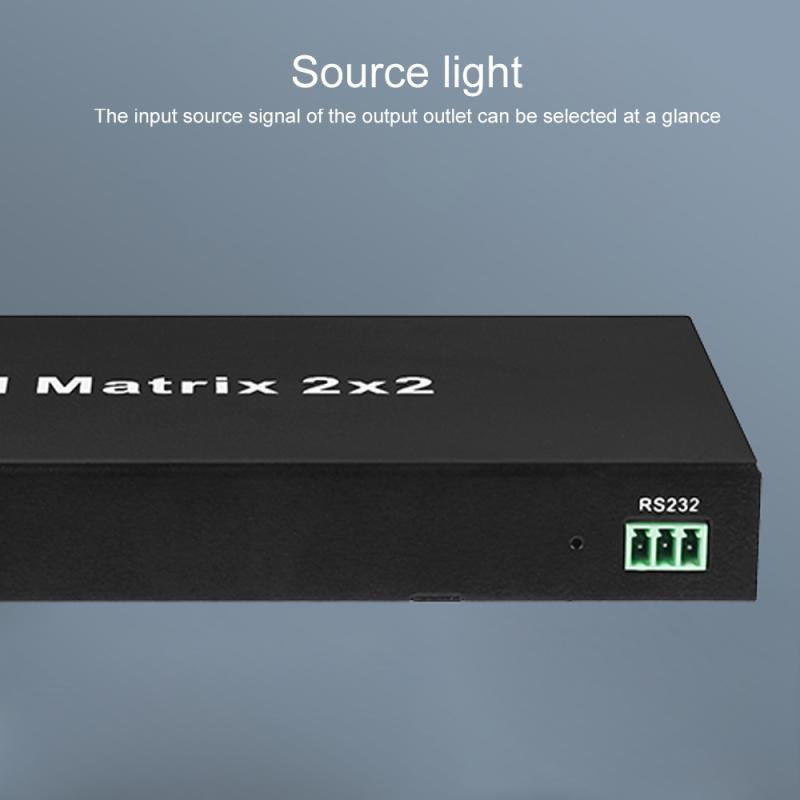 This HDMI 4K 30Hz matrix 2x2 can connect 2 HD display signal sources with 2 HD signals at the same time, and can support optical fiber and stereo headphone output. It can freely switch or distribute 2 HD signals on 2 HD-compatible monitors or projectors. The HDMI Out1 output port can realize independent audio output through optical fiber or stereo headphones. The HDMI 4K 30Hz matrix 2x2 reshapes and amplifies the input signal and transmits it losslessly through HDMI cables. The solution provided by this HDMI matrix is applied to entertainment centers, retail and websites, HDTVs, set-top disks, DVDs, projectors, data center control, information distribution, conference rooms, schools and corporate training environments for digital HDTV programs.