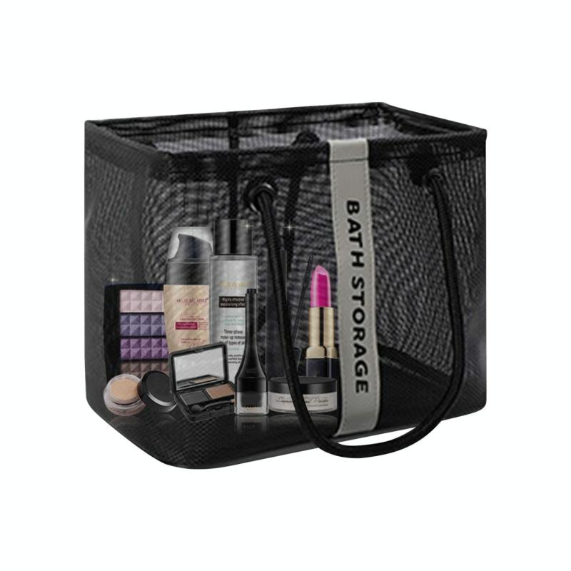 Mesh Toiletry Bag Basket Drainable Bath Bag Foldable Large Open Tote Bag Short Black