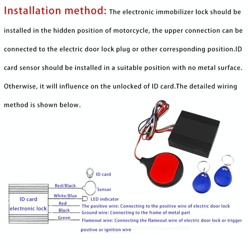 1. Function: When the motorcycle stops and turns off the electric door lock, the electronic dark lock will automatically be in the armed state and lock the ignition circuit of the whole motorcycle. Even if the thief opened the mechanical lock and the electric door lock, and remove the battery, they can not start the engine and steal the motorcycle.