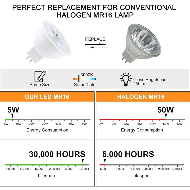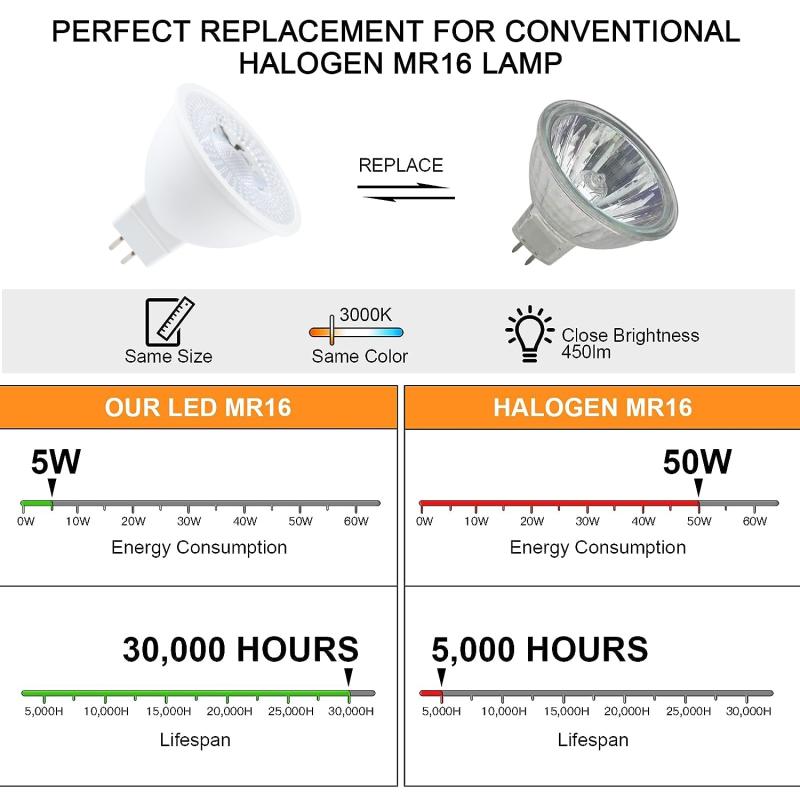2. Reduce Cost of Changing Light Bulbs: MR16 5W LED bulb with a lifespan over 30,000 hrs, can last very long time, save effort and maintenance costs on changing bulbs frequently. You could replace the MR16 20W 35W 40W traditional halogen bulb by only 5W LED, save 90% on electricity bill.