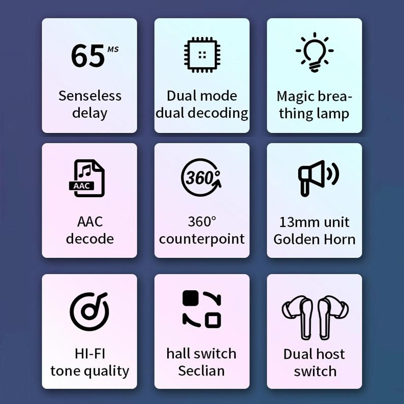 2. Features: dual mode dual decoding, magic breathing light, AAC decoding, 13mm unit speaker, HiFi sound quality, Hall switch, dual host switching, non-inductive low delay
