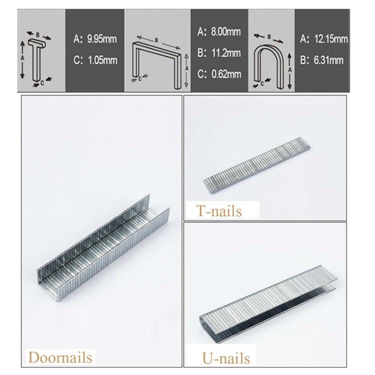 2.U type nail, T type nail, door type nail are all applicable to the nailer.