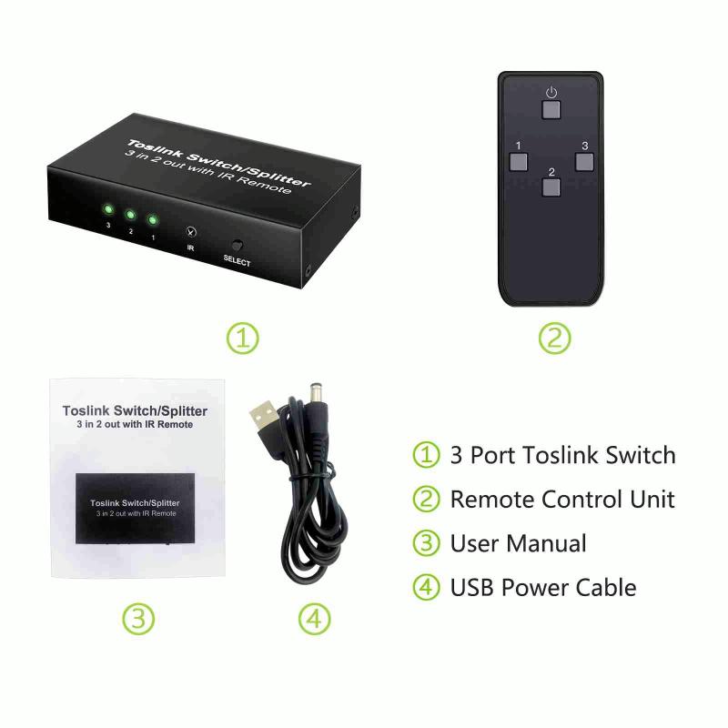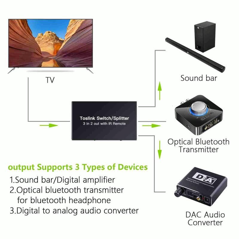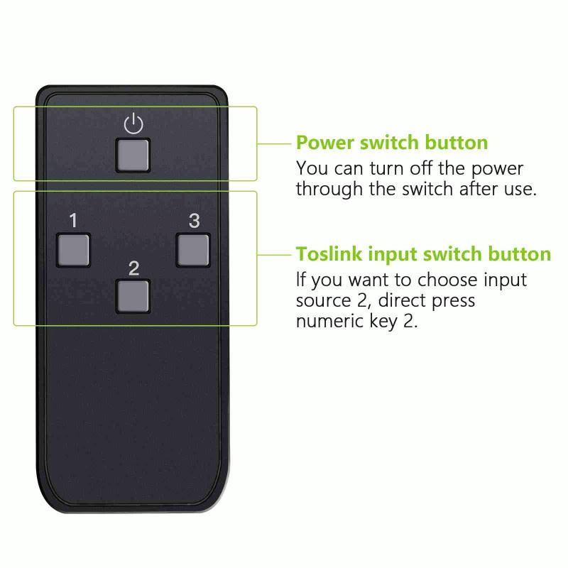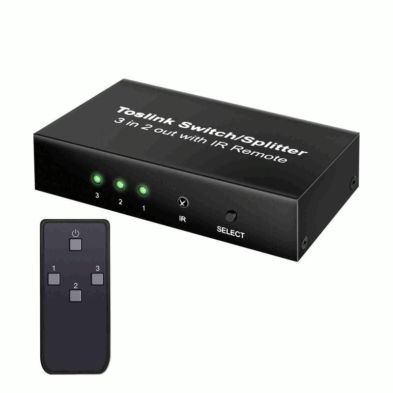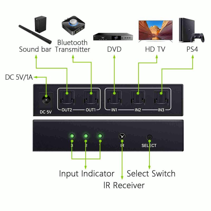 1. Three ways of optical fiber signals switch to two sets of SPDIF/TosLink signal receiving device.