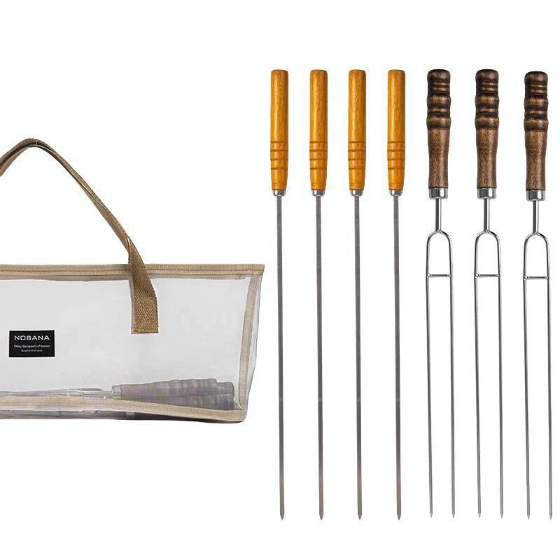 NOBANA Outdoor BBQ Grilling Fork Portable Stainless Steel Wooden Handle Grilling Skewer With Storage Bag, Spec: 7pcs /Set White (NOBANA)