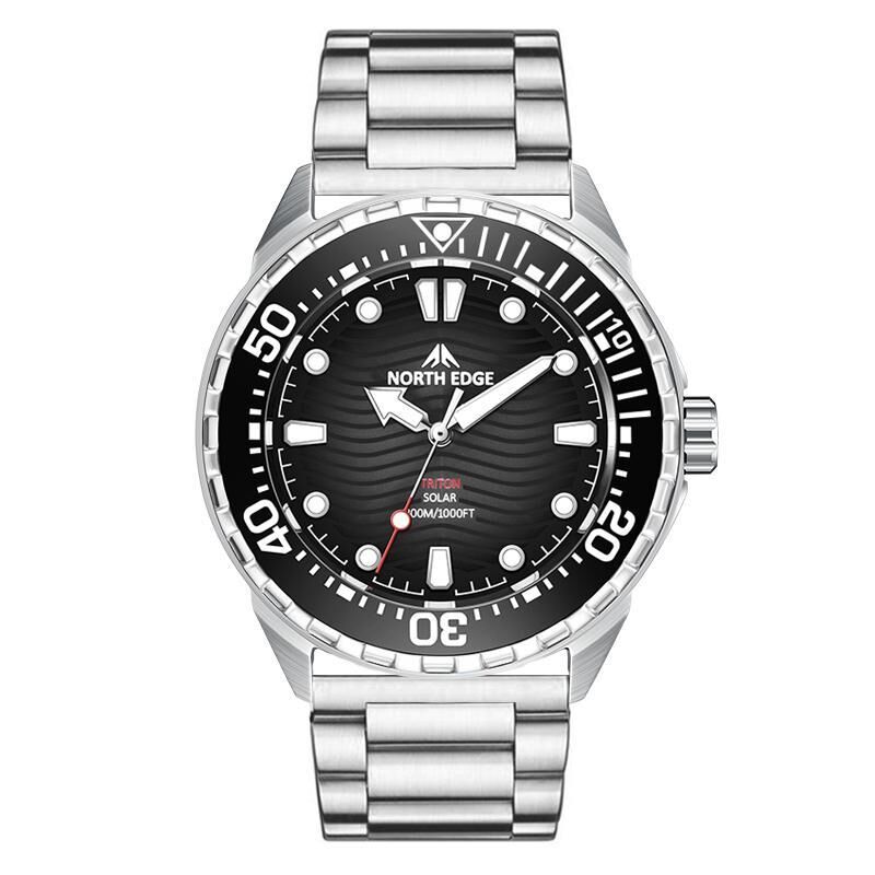 Product Description: The North Edge TRITON is a professional-grade solar-powered dive watch designed for extreme environments. Featuring a 316L stainless steel case and a ceramic unidirectional rotating bezel, its equipped with a high-efficiency solar-powered movement, offering up to 180 days of operation on a single charge, eliminating the need for frequent battery changes. Water-resistant to 300 meters, its suitable for a variety of underwater activities and is an ideal accessory for outdoor adventurers and diving enthusiasts.