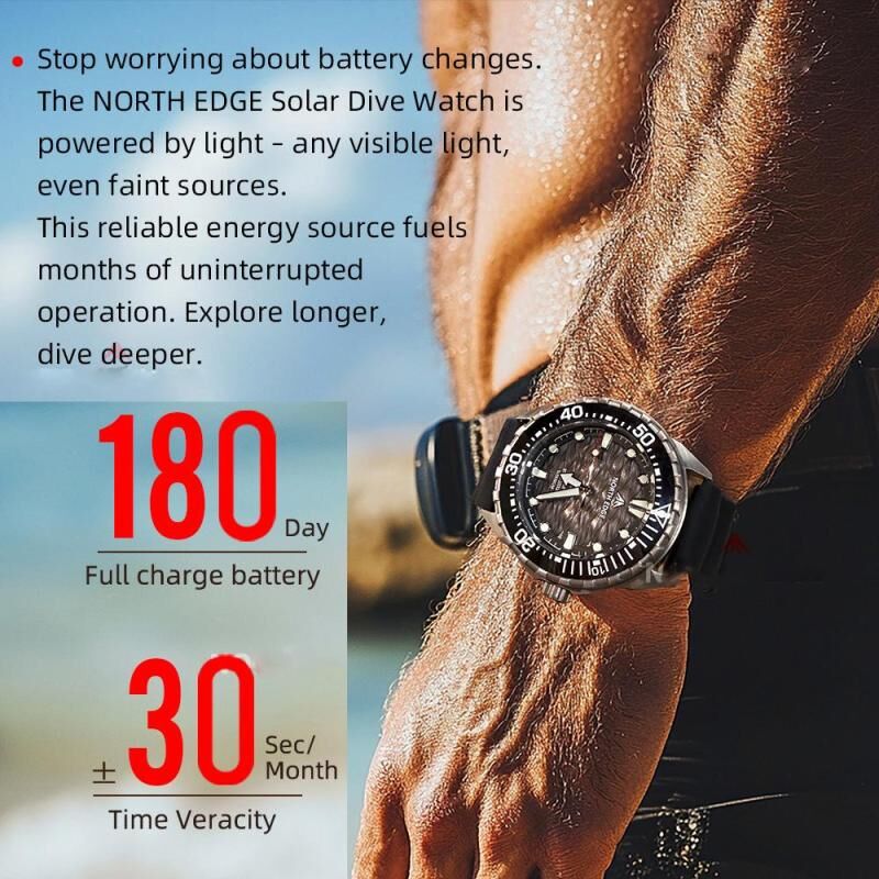 2. Solar-Powered Endurance: Charges via any visible light, 180-day full-charge battery life, +/-30sec/month time error, no frequent battery replacement.