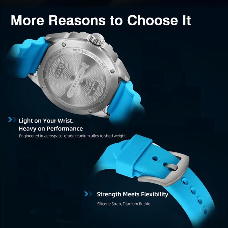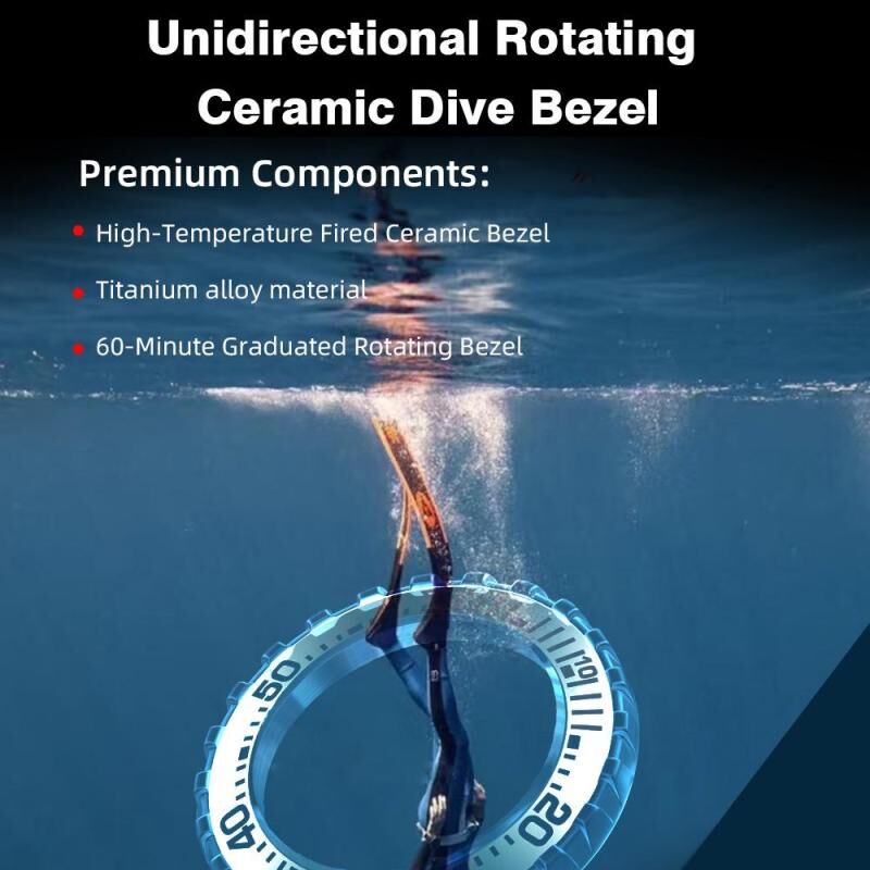 3. 300m Professional Diving Specs: Unidirectional ceramic dive bezel (60min timing) + screw-down titanium crown, 300m water-resistant, suitable for swimming, snorkeling, scuba diving.