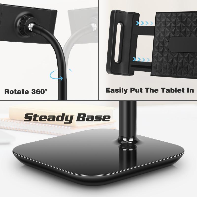 1. Material: Using heavy-duty base and ABS plastic clip, the iPad can be fixed more safely. Compatible with most tablets, it can also be easily adjusted to a comfortable viewing angle.
