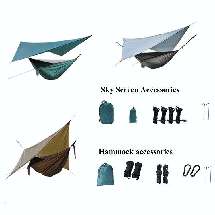 4. Accessories: 2m high-strength rope x 2, 3.6m mosquito net pull rope x 2, 8cm black buckle x 2, aluminum floor nail x 2, hammock storage bag x 1
