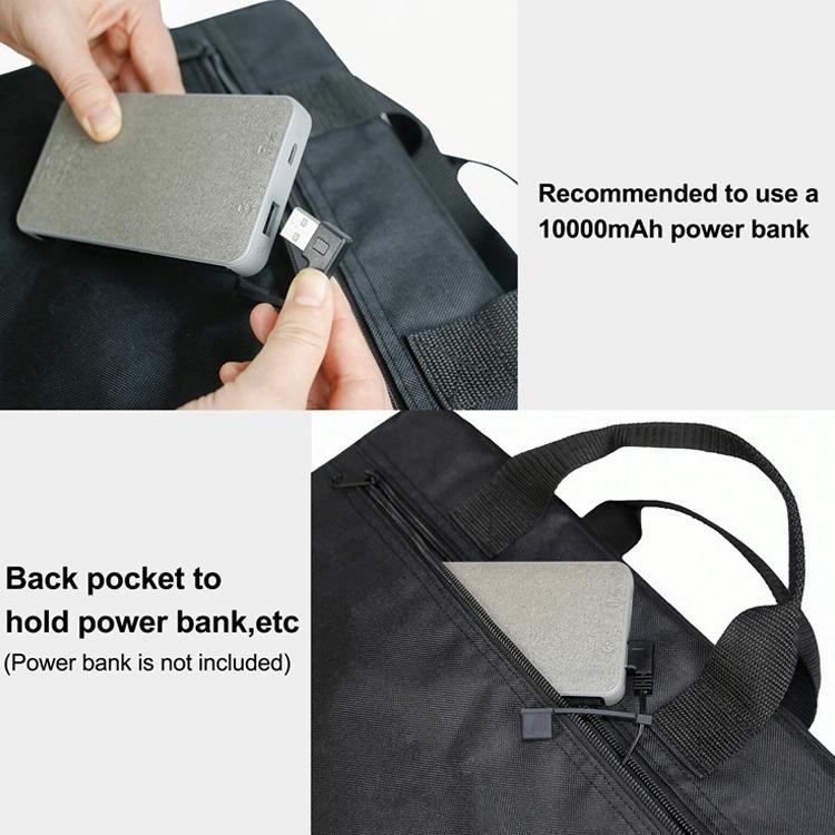 1. Material: 600D Oxford cloth + quilting cotton + 2cm pearl cotton + 2cm sponge + heating pad