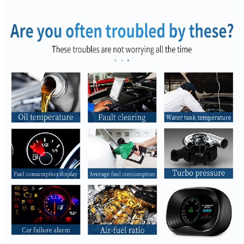 4. OBD mode display information: driving speed, engine speed, fuel consumption, water tank temperature, voltage, mileage measurement (word driving miles and single driving time, manual/automatic brightness adjustment, mile switching). Alarm: Overspeed alarm, high speed alarm, fatigue driving reminder, low voltage alarm, high water temperature alarm, engine failure alarm, and fault code elimination