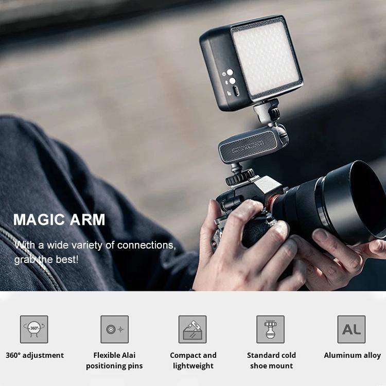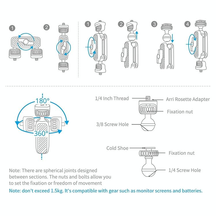 1. Uses an adjustable double ball head structure and single-knob adjustment design. While being portable, it can still tilt and rotate through 360 degree and meet the needs of shooting different scenes and angles. It can be used to connect cameras and auxiliary equipment such as lights, monitors, microphones. Note: There are spherical joints designed between sections. The nuts and bolts allow you to set the fixation or freedom of movement.