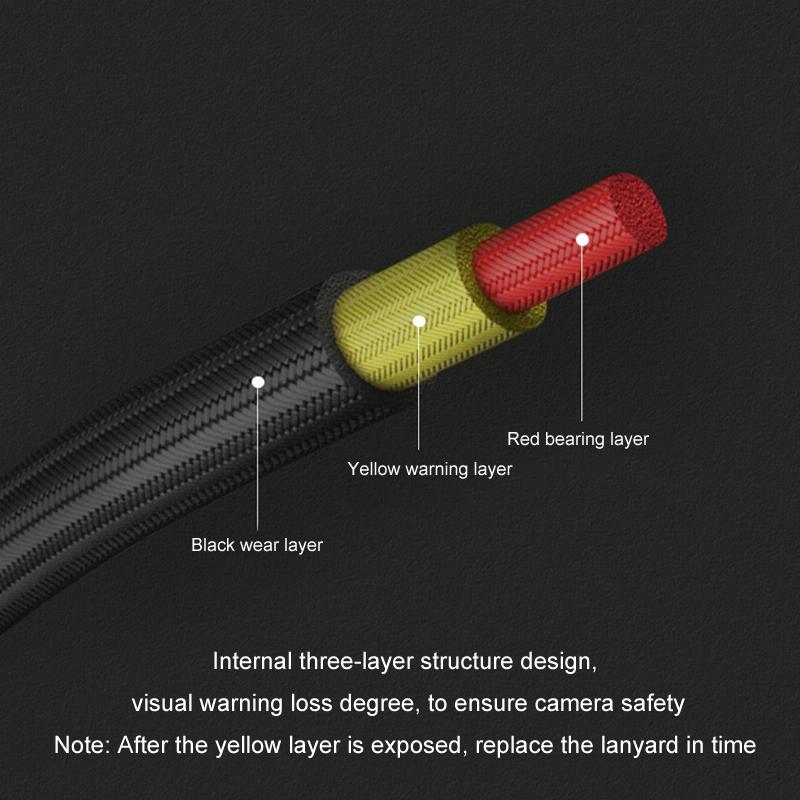 4. The internal three-layer structure design can visualize the degree of early warning loss to ensure the safety of the camera. Note: the lanyard should be replaced in time after the yellow layer is exposed