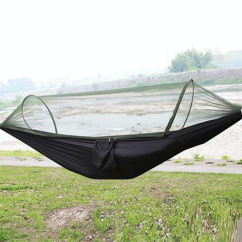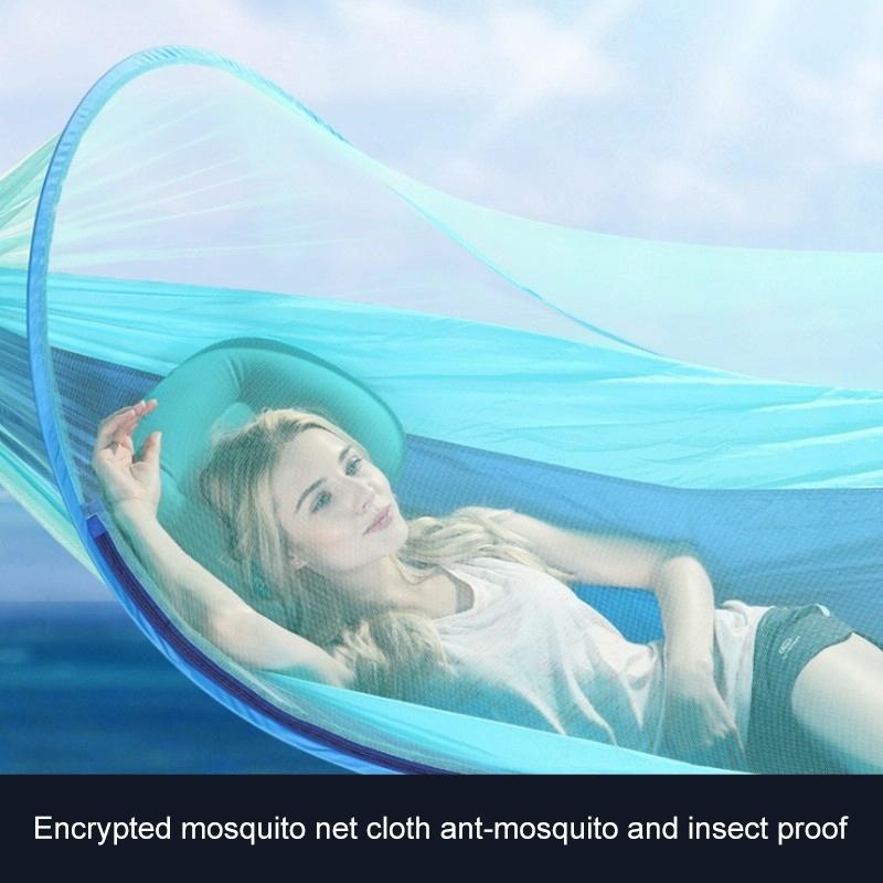 6. Automatic quick-opening hammock: hanging can be automatically opened, mosquito nets and hammock integrated design, no longer need to tie mosquito nets rope and trouble. Dual-use mosquito nets can be turned over to make the cloth face up directly when no mosquito nets are needed. The mosquito nets will cling to the cloth surface of the hammock.