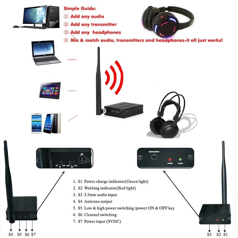 18. Countless headphones can be connected to one transmitter at the same time. The transmitter has 3 channels, and users can choose their favorite music as they like.