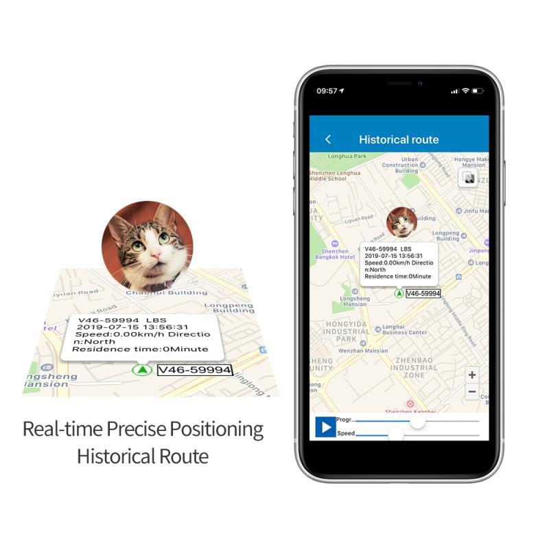 The software features real-time tracking and viewing of the location, adjusting the location upload interval, and navigating to the pet.