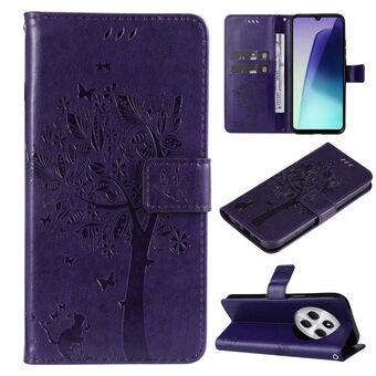 For Redmi 14C 4G Global Tree & Cat Embossed Pattern Flip Leather Phone Case(Gold)