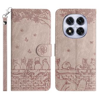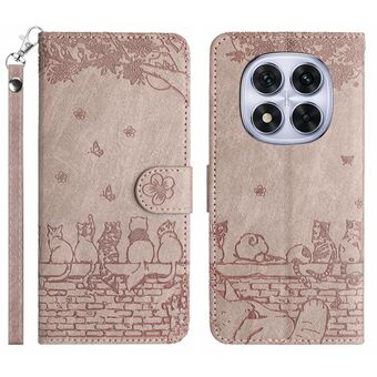 Θήκη τηλεφώνου από δέρμα με ανάγλυφο σχέδιο γάτας για Redmi Note 14 Pro 5G με κορδόνι (Μπεζ)
