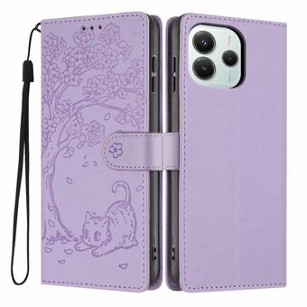 For Redmi Note 14 5G Tree Cat Embossed Flip Vegan Leather Phone Case(Purple)