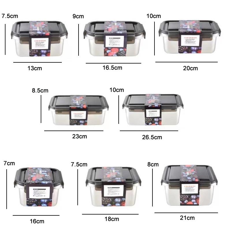8. Dimensions: rectangle 600ml 16x10.5x7.5cm; rectangle 1000ml 18x12x7.5cm; rectangle 1400ml 21x14x8cm; rectangle 2000ml 23x15x8.5cm; rectangle 2800ml 26.5x17x10cm; square 750ml 13x13x7.5cm ; Square 1500ml 16.5x16.5x9cm; Square 2800ml 20x20x10cm