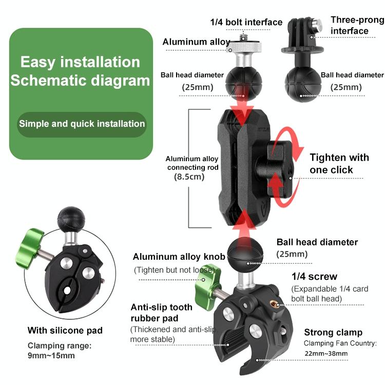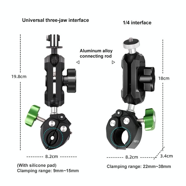 3. The double-headed clamp supports handlebars, crossbars, selfie sticks, etc. with a diameter of 22-38mm;