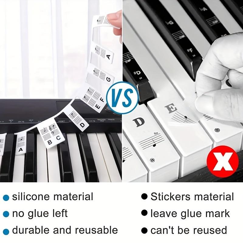 2. The piano keyboard stickers are made of high-quality flexible silicone, which is easy to remove and rearrange, without glue. They can fit the keys without interference, and the length of the labels is suitable and will not affect your performance.