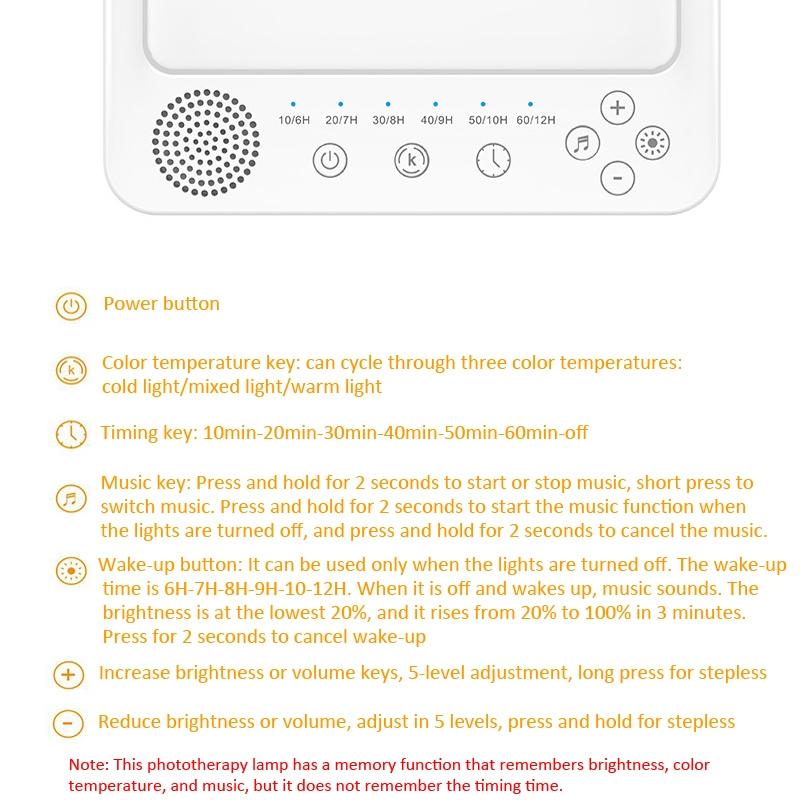 2. 3 color temperatures, 5 adjustable brightness and memory functions: The phototherapy lamp provides 3 color temperature modes (cool white/mixed/warm white) from 2800K to 6500K, 5 adjustable brightness levels, long press to control stepless adjustment Light, convenient memory function will remember all your previous settings for next time (color temperature, brightness, music)