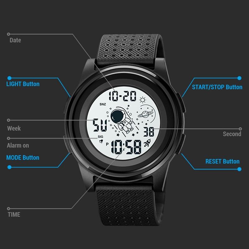 1. Functions: dual time, stopwatch timing, EL luminous light, date display, alarm clock, week display, hourly timekeeping, 12/24 hour format
