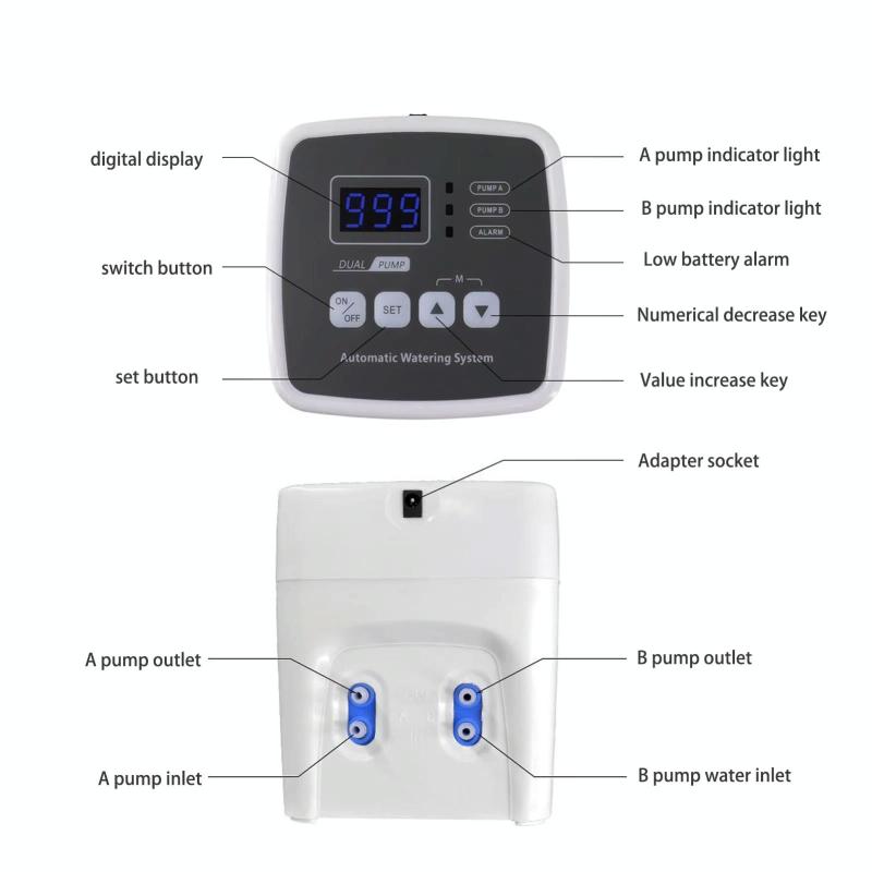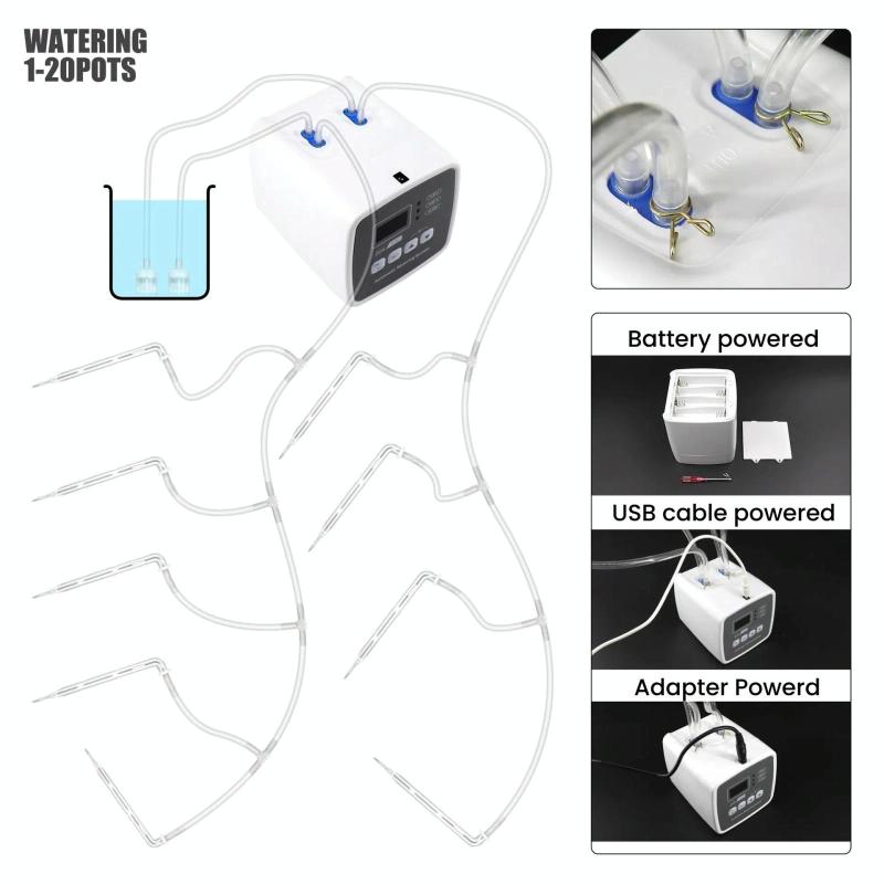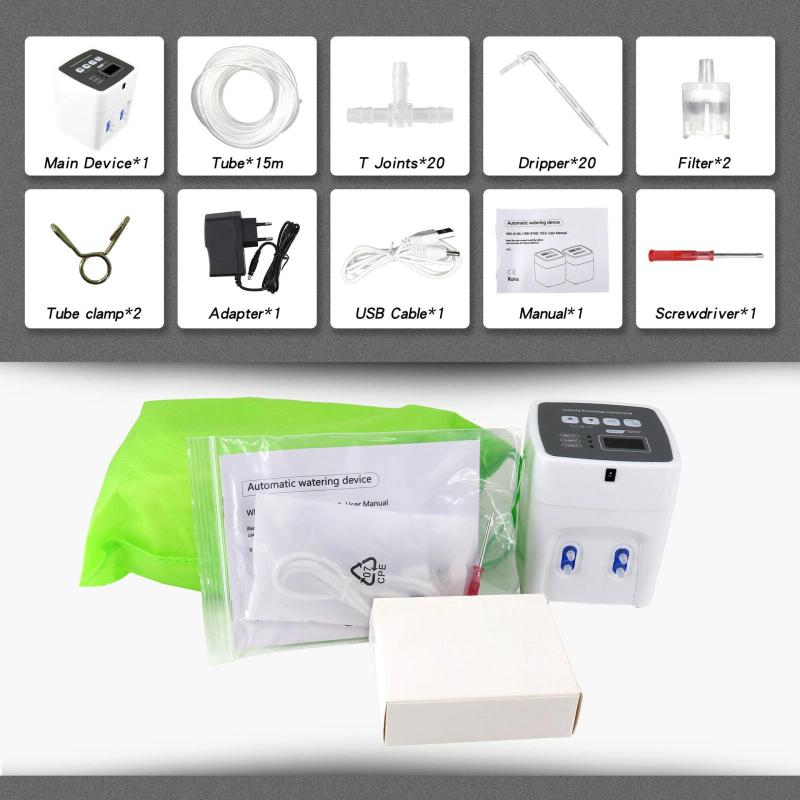 1. Dual-pump collaborative operation system: equipped with an independent dual-control water pump device, a single machine can irrigate 20-30 pots of plants simultaneously (the standard configuration includes 20 pots of components, which can be expanded as needed). The dual-channel design ensures uniform water distribution to meet the needs of multiple scenarios, such as balcony gardens/greenhouses.