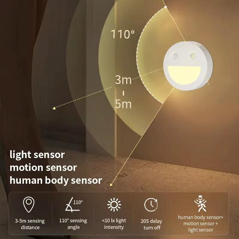 1. Smart induction night light: built-in high-precision human body sensor and light sensor, the light turns on when people come in the dim environment, and turns off when people leave, saving energy and electricity without switching.