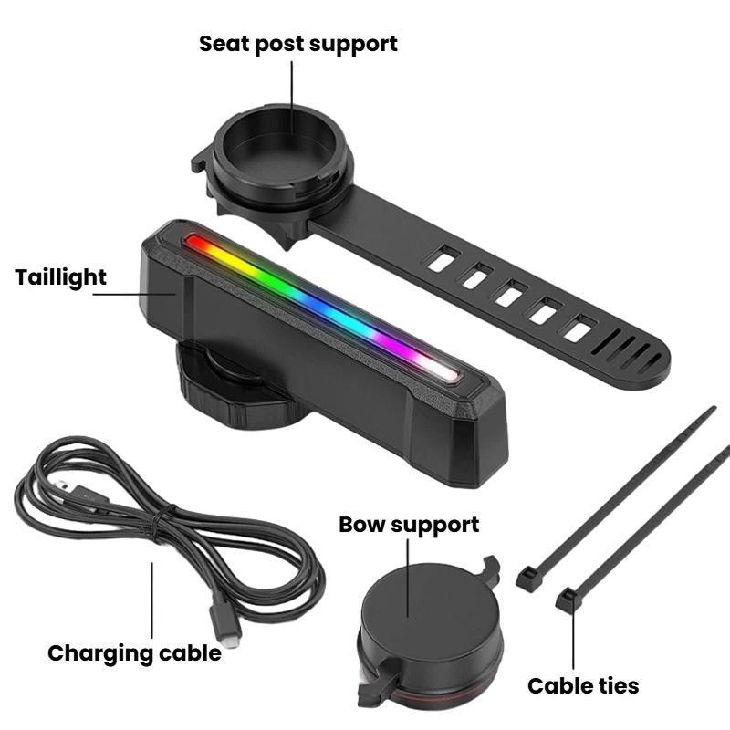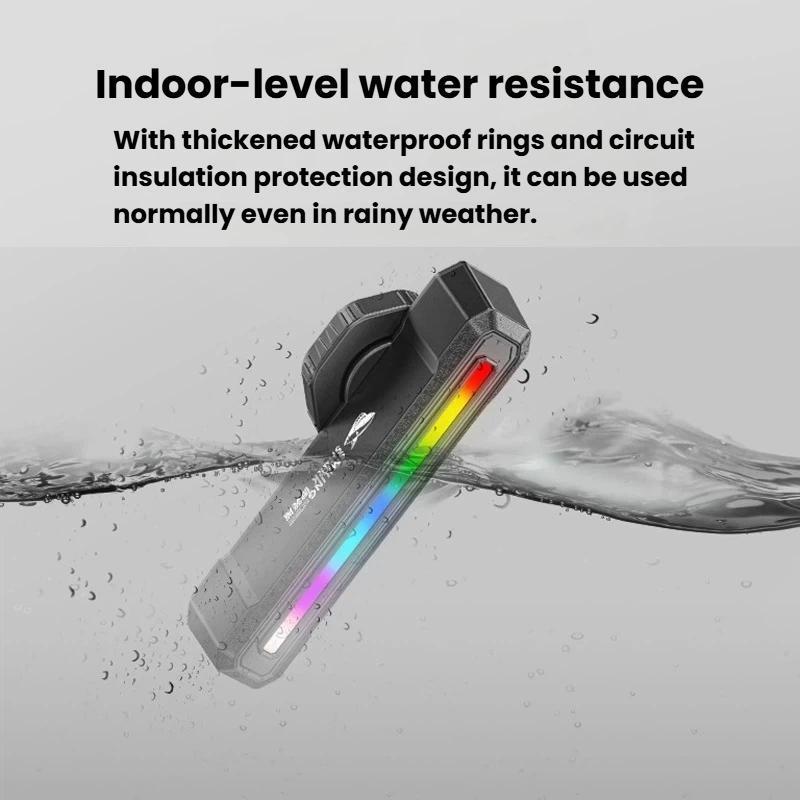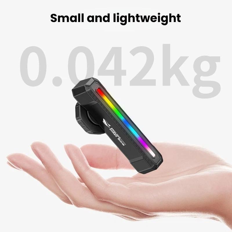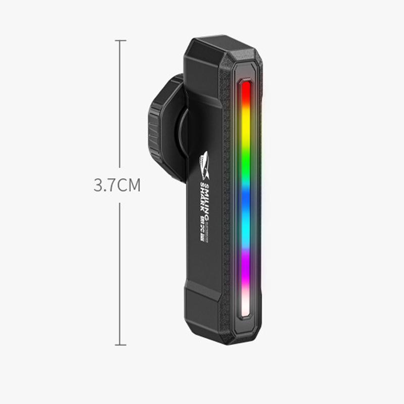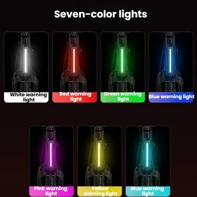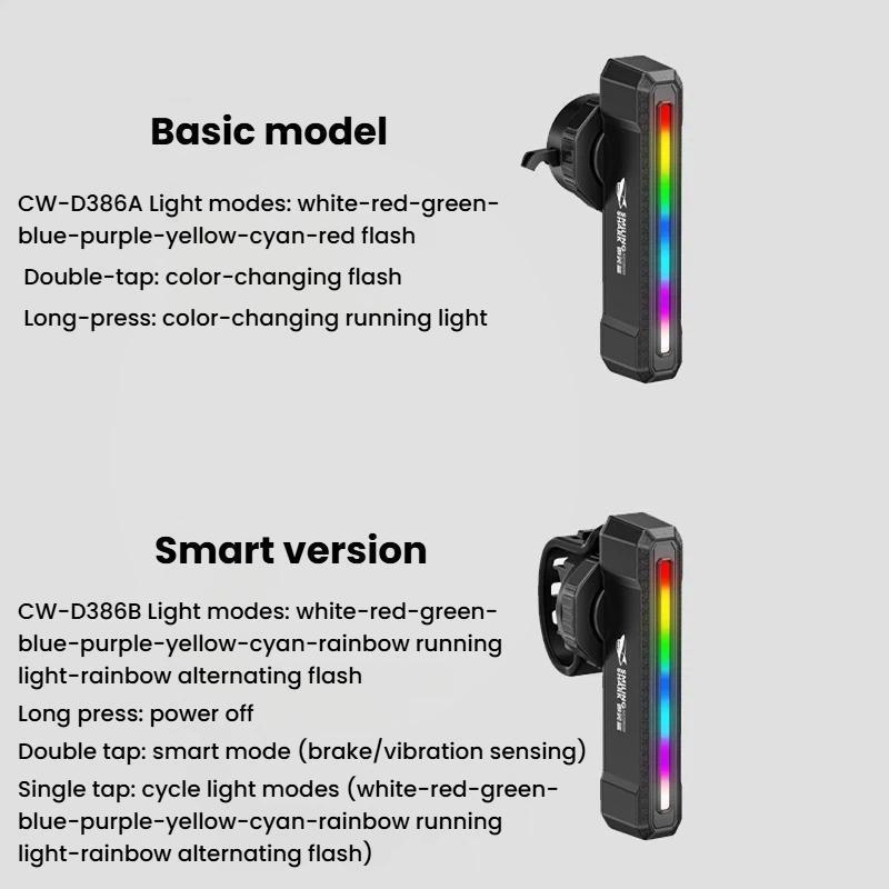 - CW-D386B: white-red-green-blue-purple-yellow-cyan-rainbow running light-rainbow alternating flash; long press: power off; double tap: smart mode (brake/vibration sensing); single tap: cycle light modes (white-red-green-blue-purple-yellow-cyan-rainbow running light-rainbow alternating flash)