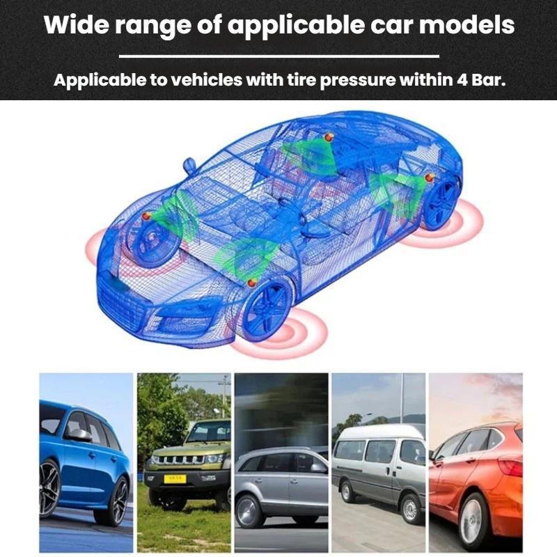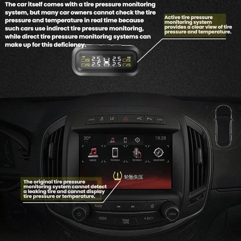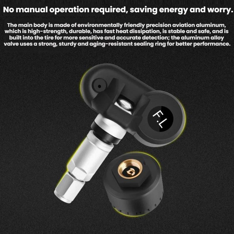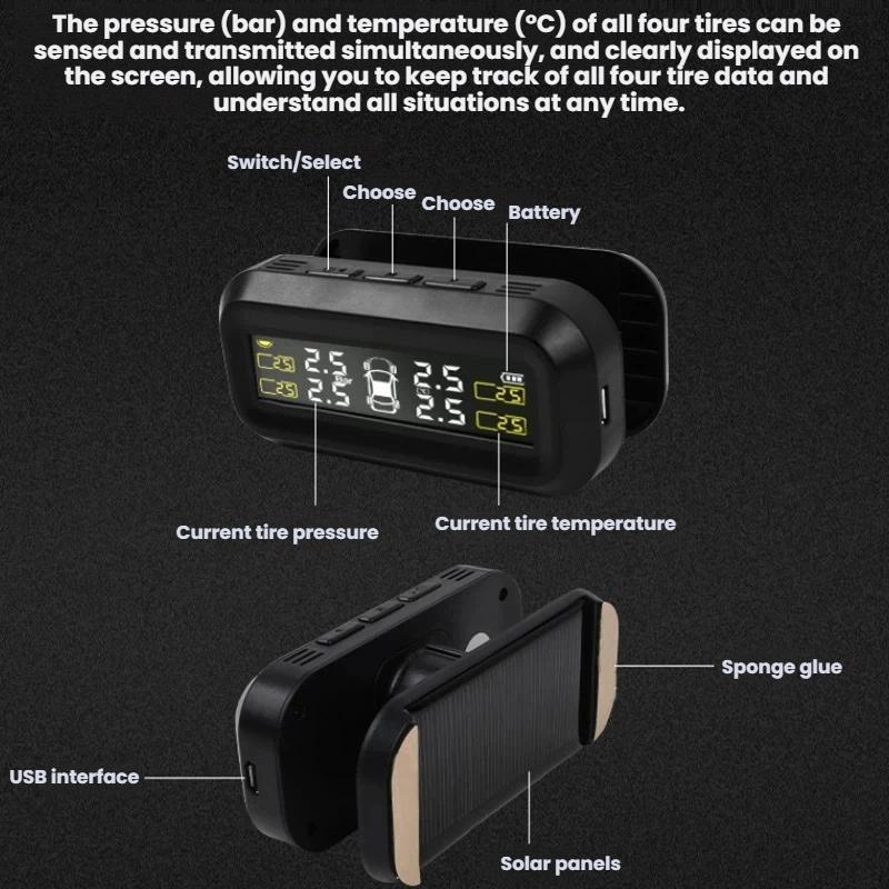9. Simultaneously senses and transmits the pressure (bar) and temperature (degrees Celsius) of all four tires, clearly displaying them on the screen for real-time monitoring of all four tire data.