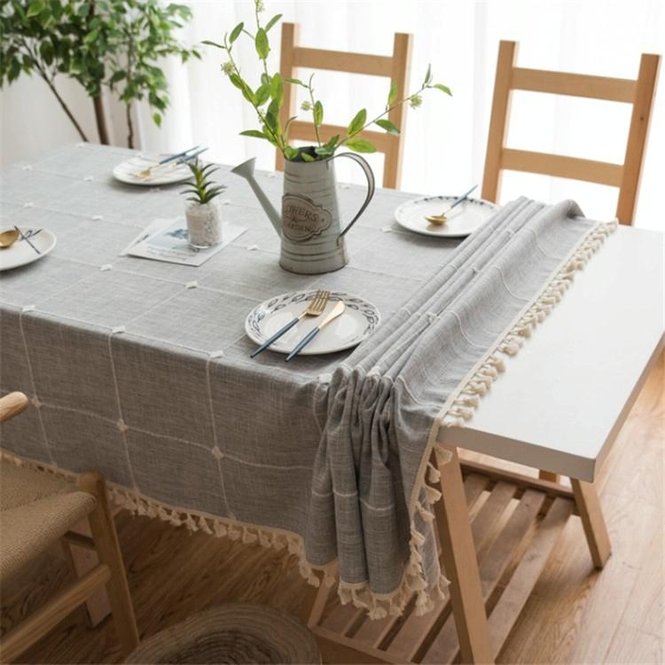 Square Lattice Embroidered Tablecloth Pure Color Cotton Linen Tassel Rectangular Coffee Table Mat, Size:90x140cm(Grey)