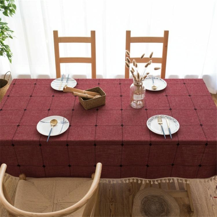 Square Lattice Embroidered Tablecloth Pure Color Cotton Linen Tassel Rectangular Coffee Table Mat, Size:90x140cm(Red)