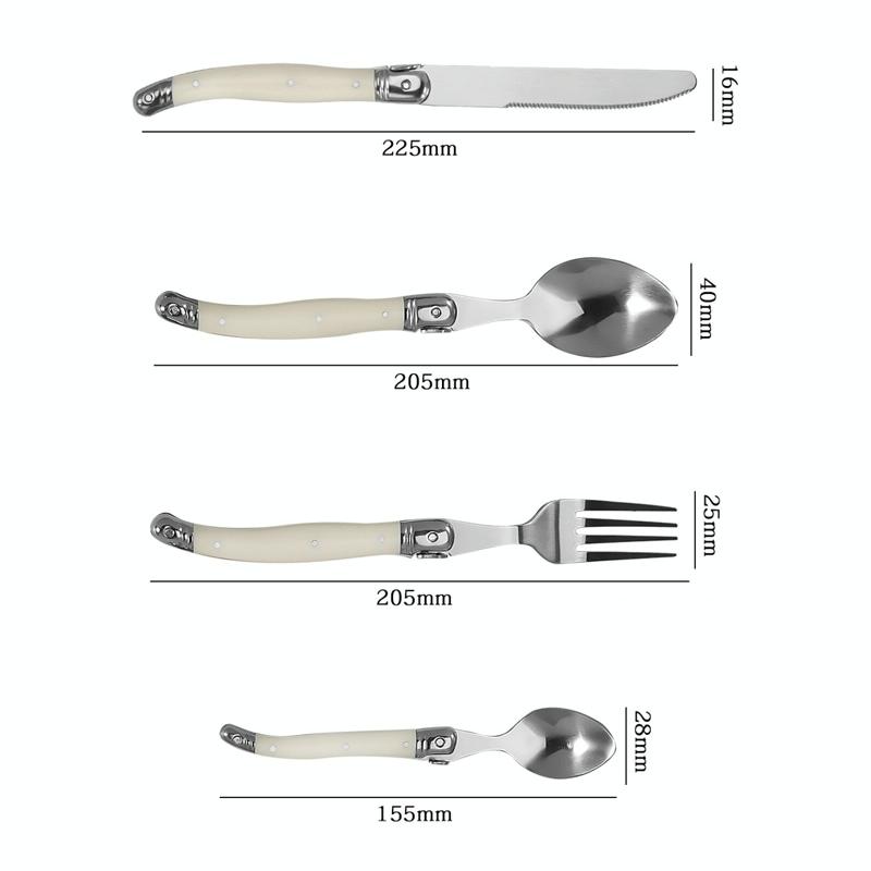 5. Size: knife 225 x 16mm, fork 205 x 25mm, spoon 205 x 40mm, tea spoon 155 x 28mm
