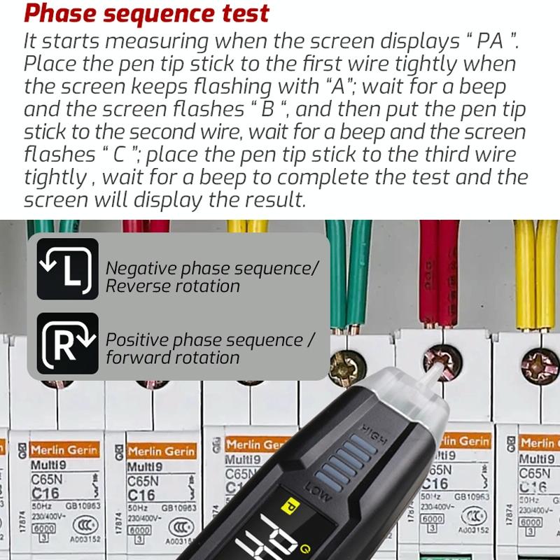 3. Phase sequence judgment, the screen shows PA, start measuring, display A constantly flashing will be the tip of the pen close to the first phase line, wait for a beep to show flashing B and then the tip of the pen close to the second line, wait for a beep to show a flashing C symbols, will be the tip of the pen close to the third line, wait for a beep to complete the test, the screen displays results