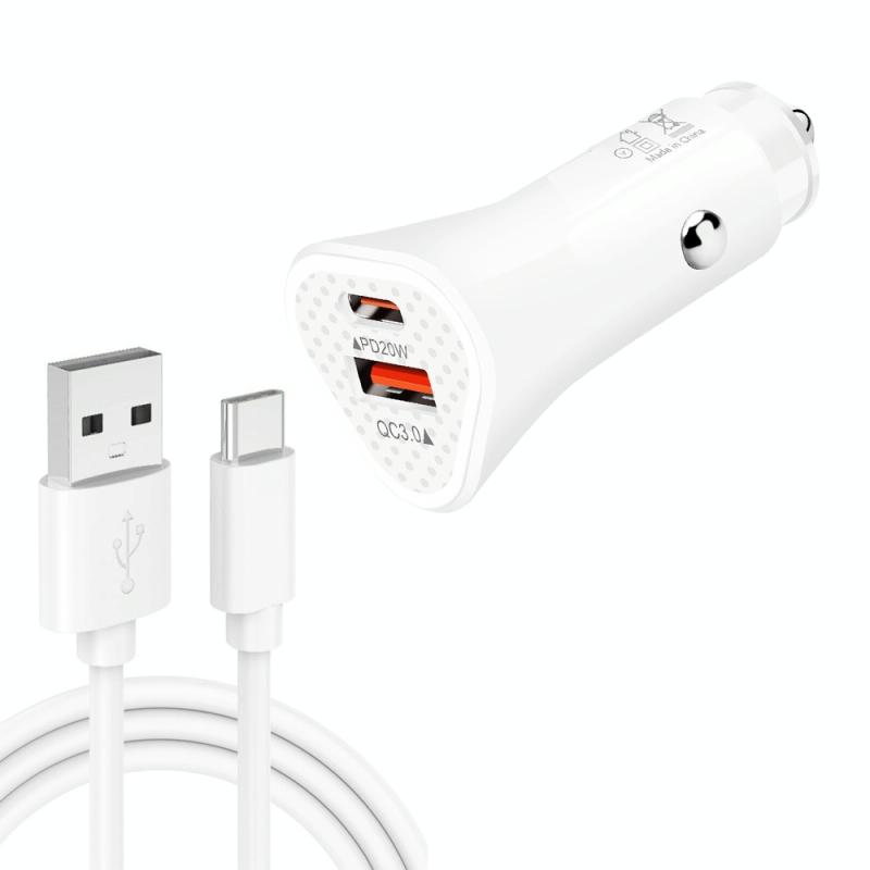 TE-P23 38W PD 20W USB-C / Type-C + QC3. 0 USB Triangle Car Charger + USB to USB-C / Type-C Data Cable, Length: 1m(White)