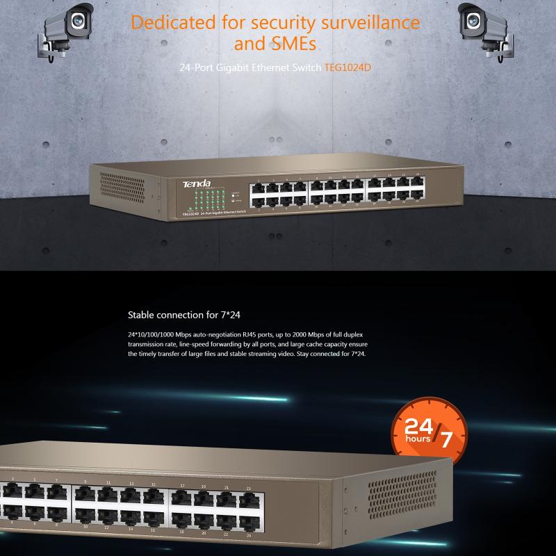 1. TEG1024D is a 24-port gigabit unmanaged desktop/rack switch designed for video surveillance in offices, work groups, and SMEs for easy, economical and high-speed internet purposes.